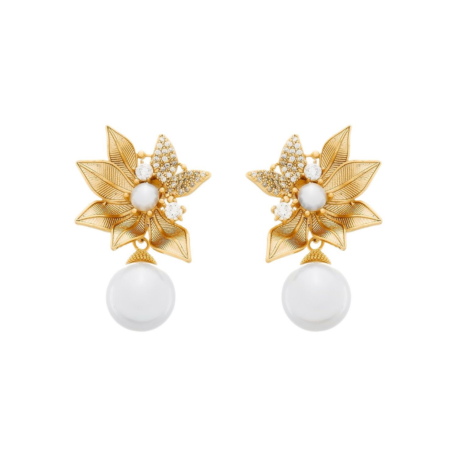 Brinco Dourado com Folhas em Zircônia e Pérolas
